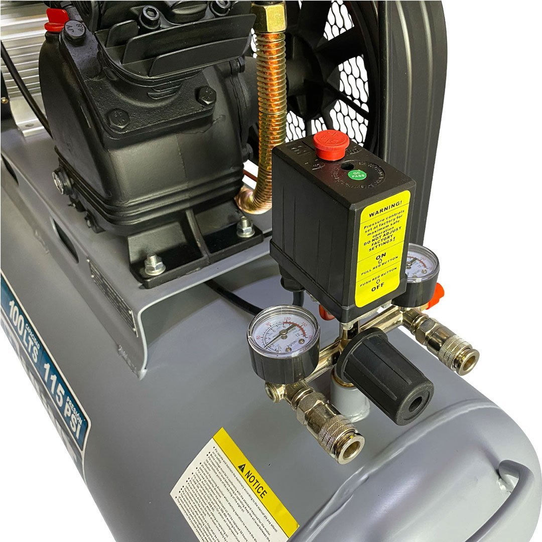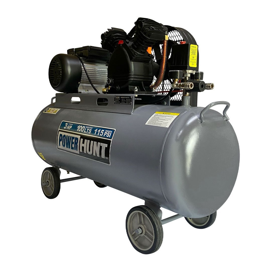 El Compresor COMPH100L Power Hunt con banda y doble conexión rapida con capacidad de 100 litros, este equipo puede alcanzar hasta 1050 rpm.