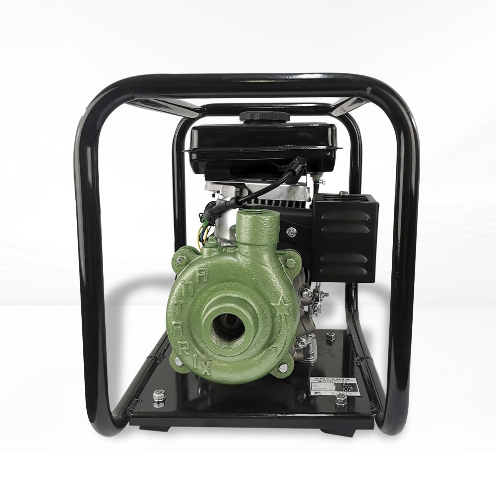 Motobomba centrífuga marca Antarix, cuenta con motor a gasolina de 4 tiempos, una potencia de 2.5 hp. La bomba tiene una capacidad máxima de flujo de 160 litros por minuto y una cabeza máxima de 42 metros.