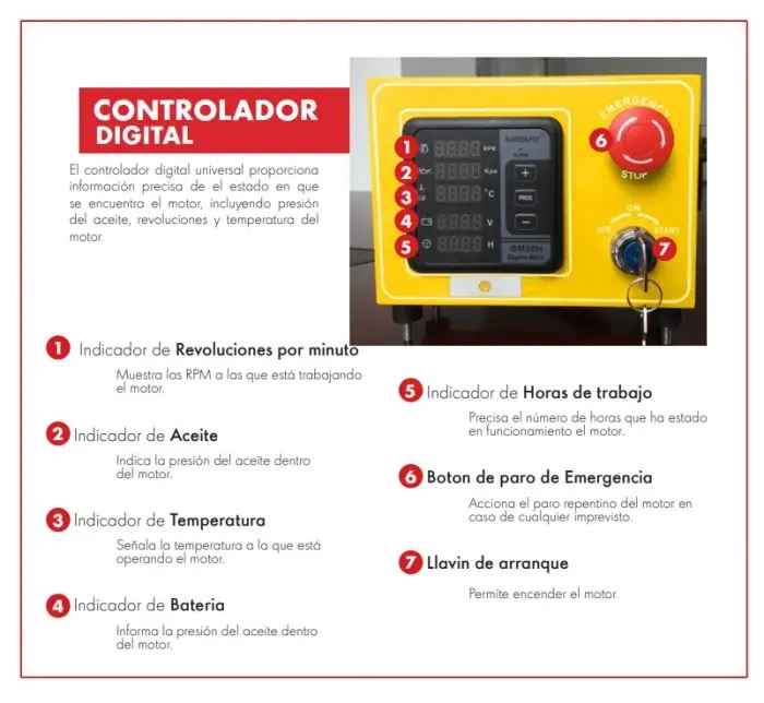 - Facilidad de uso: El sistema de arranque eléctrico y los medidores de funcionamiento integrados permiten una operación sencilla y monitoreo constante del rendimiento del motor.
